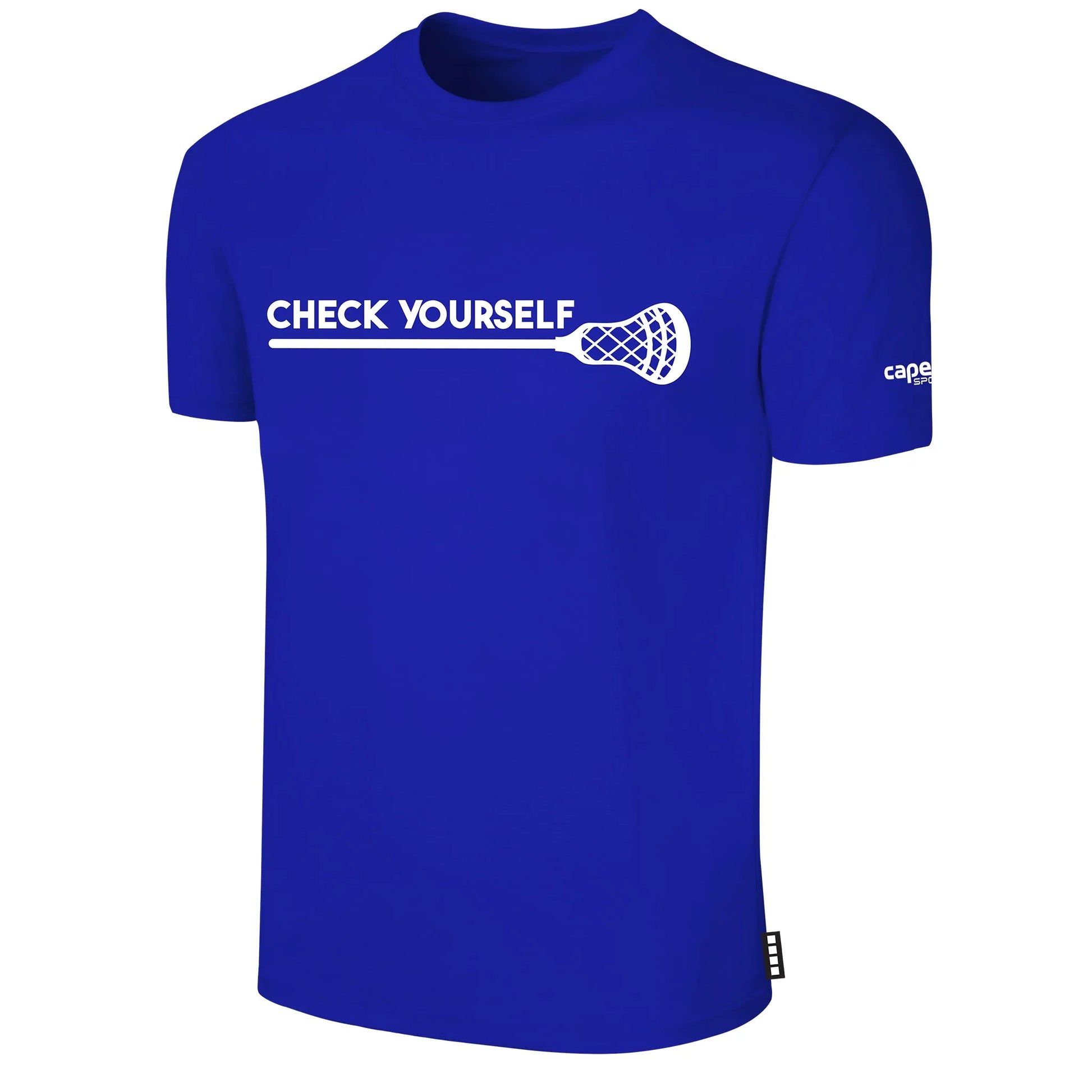 Kick off the school year in style with the Check Yourself Youth Tee — where classroom confidence meets lacrosse spirit. Made from 100% soft, breathable cotton, this lightweight shirt keeps you comfortable from the first bell to after-school practice. The bold “Check Yourself” graphic, underlined by a lacrosse stick, brings attitude and energy to your look, while the embroidered Capelli Sport sleeve logo adds a premium touch. Machine washable for everyday ease, this tee is ready for whatever the day brings — books, friends, or the field.