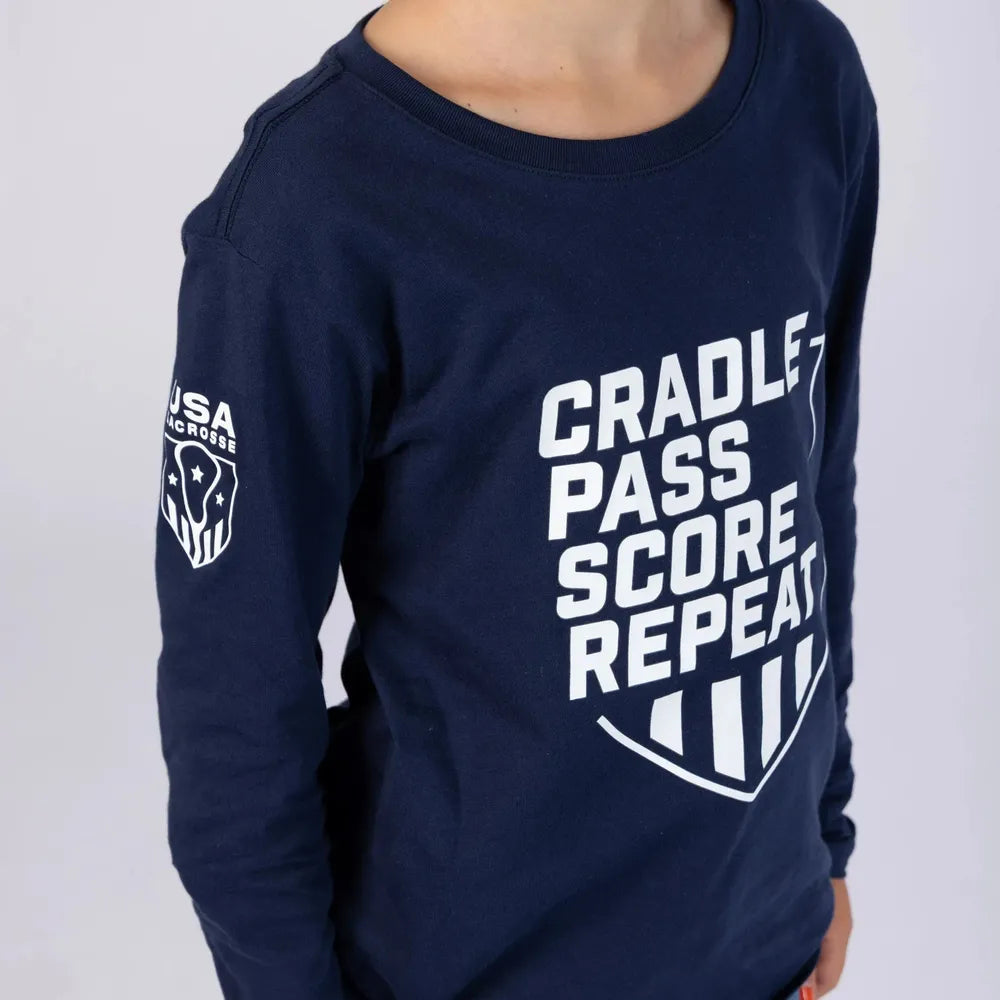 Game plan? Always. The Cradle. Pass. Score. Repeat. Youth Long Sleeve Tee is built for school days, practice nights, and everything in between. Made from 100% soft, breathable cotton, it’s comfortable enough for class and durable enough for the field. The bold front graphic celebrates your love for lacrosse, while the embroidered Capelli Sport sleeve logo adds a premium finish. Lightweight yet perfect for layering, this machine-washable tee is ready for every season — and every play.