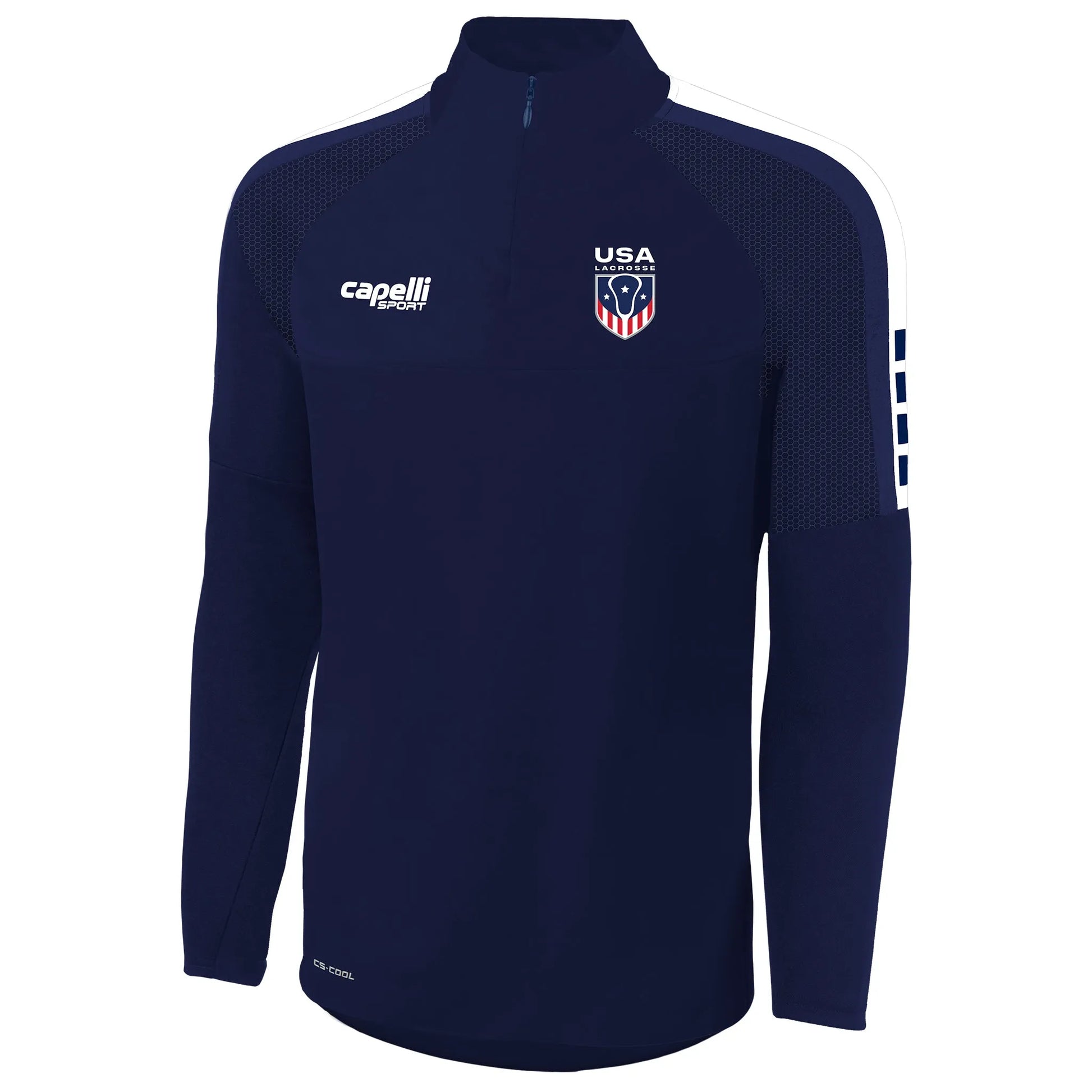 The USA Lacrosse National Team Madison ¼ Zip Training Top is designed for performance and comfort. Made with CS-Cool fabric technology, it enhances breathability and wicks moisture to keep you dry through every warm-up or workout. Its technical stretch polyester/spandex blend allows full mobility, while invisible thumbholes and a longer back hem provide added coverage and function. Finished with the USA Lacrosse emblem, this unisex ¼ zip delivers sleek, athletic style on and off the field.