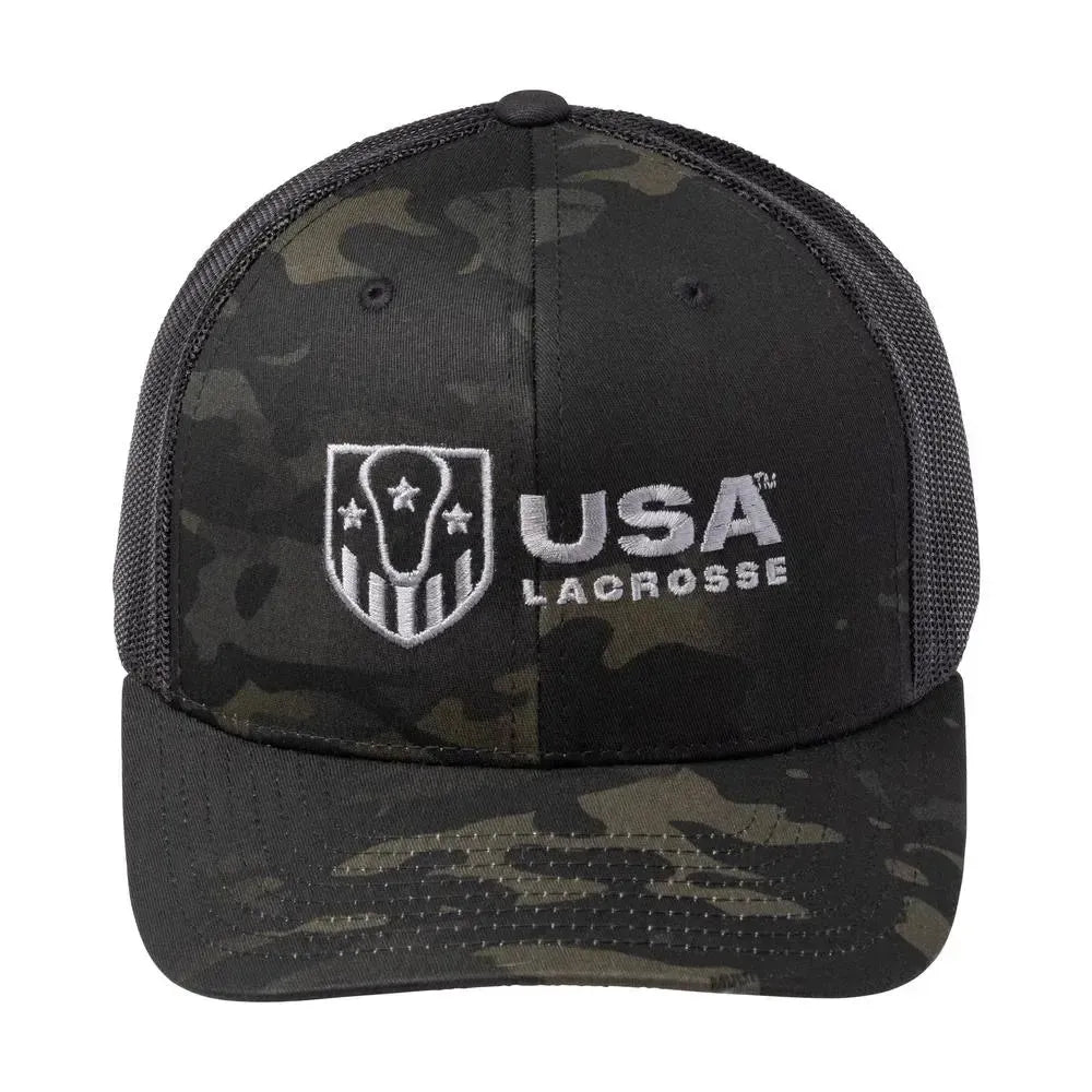 Elevate your game-day appearance with the USA Camo Trucker Hat - a combination of pride and tough style. Designed for devoted lacrosse enthusiasts, this hat features a gritty camo pattern and proudly displays the USA Lacrosse emblem, making your allegiance clear. It’s got that comfy, locked-in fit that’s perfect whether you’re hyping up the team at practice, cheering from the stands, or just rolling through your day. Know a lacrosse nut who'd love it? This is the gift they'll never shut up about. Grab yours now before they're history and wear that USA Lacrosse spirit everywhere you go!